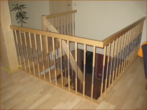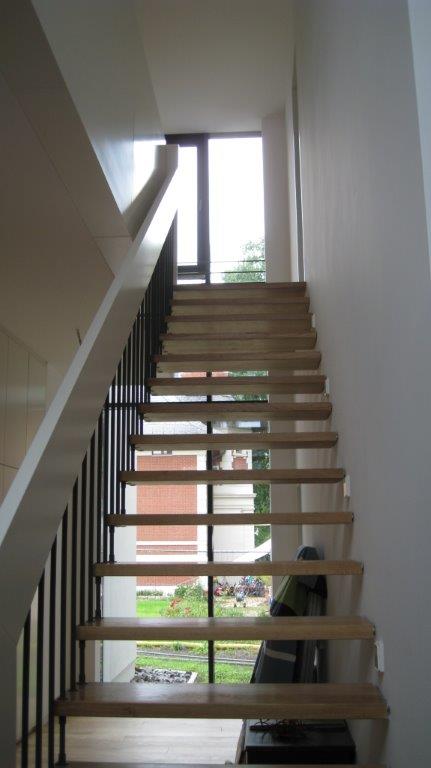 Treppenlauf mit 16 Steigungen Laufbreite von 900 mm, Stufen Eiche massiv 45 mm, Wandseite mit Bolzenauflage, Geländer handlauftragend mit Systembolzen verschraubt, Stab 16 mm Stahl lackiert in RAL- Farbe